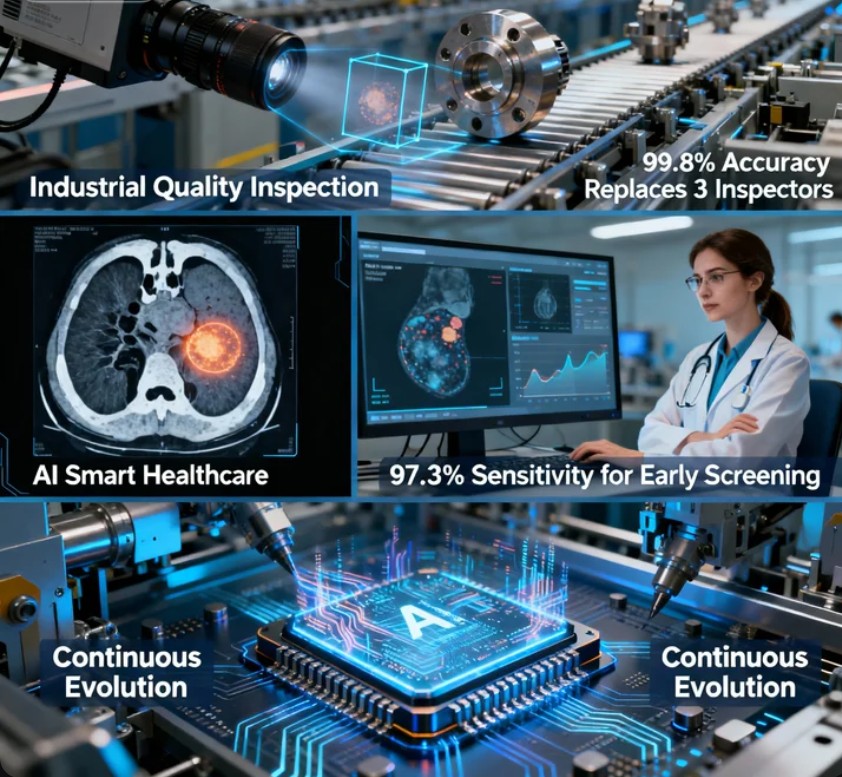 - Industrial quality inspection: ms-level inference, 99.8% accuracy; three inspectors replaced per camera